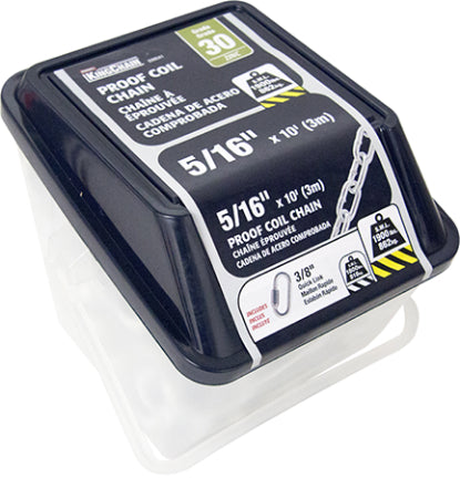 View full detailsGalvanized Grade 30 (G30) Proof Coil Chain, packed in a convenient, reusable storage tub. Safe Work Load (SWL) of 1,300 lbs. Zinc-Plated Quick Link...