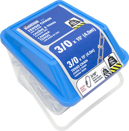 View full details3/0 x 15’ Zinc-Plated Tenso Chain, packed in a convenient, reusable storage tub. Safe Work Load (SWL) of 305 lbs. Comes with one 3/16" Zinc-Plated ...