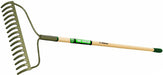 Welded bow rake with 54” lacquered ash handle and 6” grip. 16 curved teeth. Clear-coated gray-steel finished head.